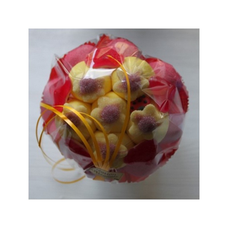 Bouquet de fleurs en bonbons orange/vert fleurs rouges avec sa coccinelle en...