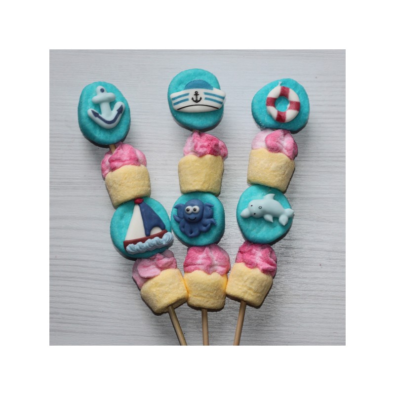 Brochette de bonbons réalisée avec des guimauves , des cupcakes et des sujets en sucre sur le thème de la mer ( modèle aléatoire )