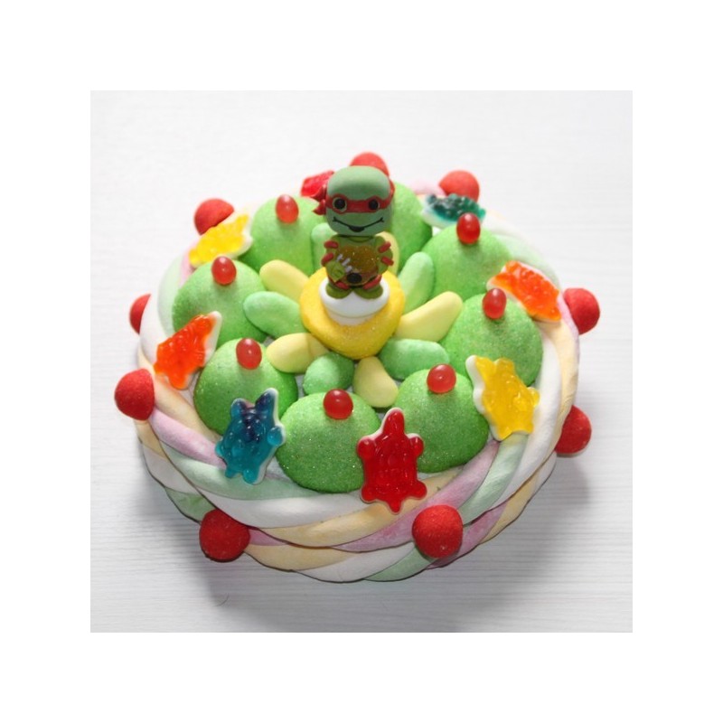 Le gâteau de bonbons Tortue Ninja est réalisé à base de guimauves , de mûres , de bananes Haribo , de citrons , de fraise Tagada Haribo et de son personnage préféré , une tortue Ninja au centre .