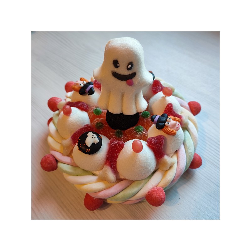 Le gâteau de bonbons Halloween en bonbons est réalisé avec différentes guimauves , des os , des citrouilles , des fraises Tagada Haribo , des fantômes et des sorcières en sucre et au centre un tendre fantôme en bonbon ( sujets en sucre pouvant variés d'un gâteau à l'autre )