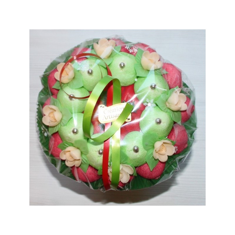 Le bouquet de fleurs Star spécial Noël se compose de guimauve à la fraise et à la pomme , de coeurs à la fraise , de fleurs en azime , de perles en sucre et d'une feuille de houx en plastique