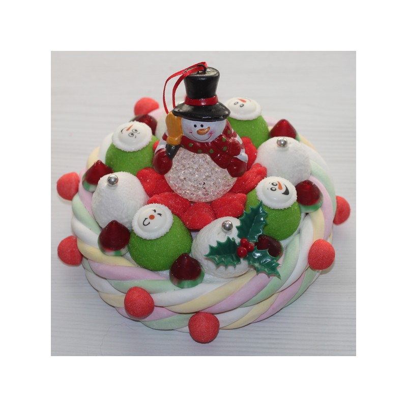 Gâteaux de bonbons de fête réalisé avec divers guimauves à la vaille et à la pomme , des Bonhommes de neige en sucre , des fraises , des cônes twist à la fraise , des fraises Tagada Haribo , des perles en sucre, tout ceci accompagné d'un Bonhomme de Neige lumineux et d'une feuille de houx non comestible.