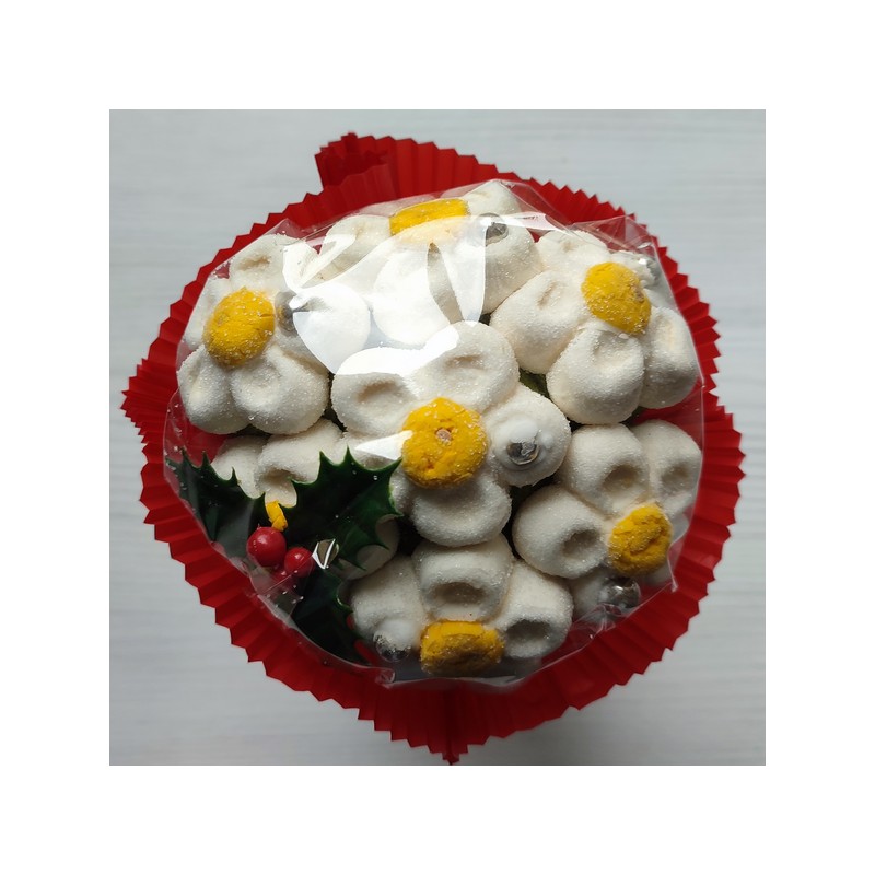 Bouquet de bonbons Noël réalisé avec 14 guimauves , des perles en sucre et une feuille de houx non comestible