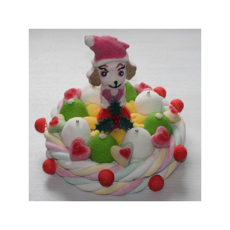Le gâteau de bonbons de fête Pat Patrouille est réalisé à base de guimauves , de coeurs , de fraise Tagada Haribo , de citrons , de divers sujets en sucre , d'une feuille de houx non comestible et d'un personnage Pat Patrouille en Marshmallow ( modèle aléatoire )