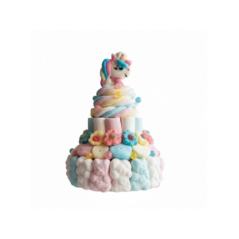 La pièce montée Baby Shower avec réalisée avec différentes guimauves dont des oursons aux couleurs pastels, des fleurs, des dragibus Haribo et au sommet une licorne.
